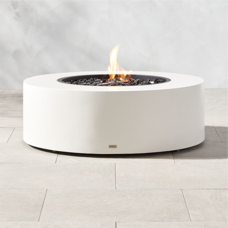 EcoSmart Fire's minimalist fire table offers a bold industrial presence and warmth on chilly summer nights. Expertly engineered using a lighter-weight concrete composite, bone white fire table is molded into a sleek silhouette and filled with contrasting black glass charcoal to produce tall, dancing flames.