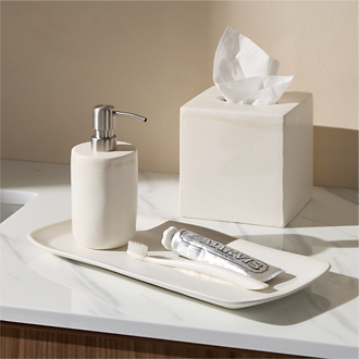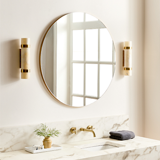Treat your en suite to modern bathroom hardware. After you've found the right bath linens, keep them fresh by hanging them up to dry. Conserve space by mounting a towel bar on the wall near the shower. Then, put a coordinating towel ring near the sink so that a hand towel is always within easy reach. Tie everything together with coordinating bathroom hardware for the cabinets and a few shelves for spare towels and toiletries. For a trendy vibe, consider brushed brass bathroom hardware. Dress it up with black and acrylic decor, or keep it chill with blue and dark wood accents. If you'd rather incorporate vintage elements, consider ceramic bathroom hardware and pair with clear glass bathroom accessories. You can even coordinate the hardware in your bathroom with your bedroom furniture drawer handles for the ultimate put-together look. Not allowed to drill holes in the wall? No worries—standing towel racks allow you to store your linens and get back your security deposit. For more drill-free bathroom accessories, look for free-standing toilet paper towers, mirrors and shelves, too.