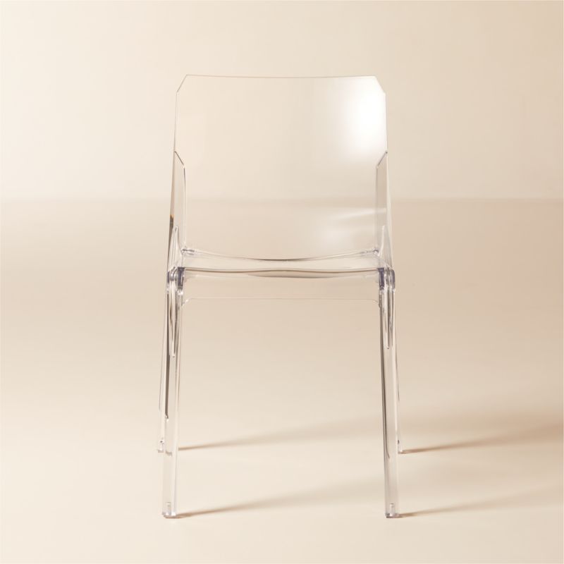 Italian-made seat bares it all in barely-there clear polycarbonate. Thick-cut and modern, dining chair clearly works with any table. Even better, chairs stack up to disappear in an instant. CB2 exclusive.