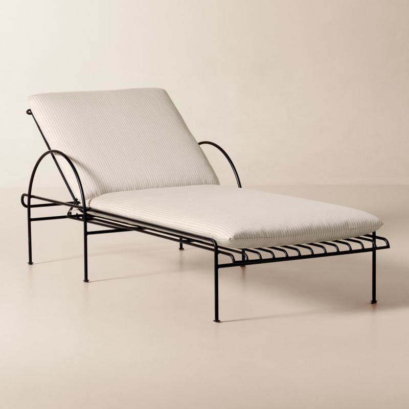 Sun lounger by Melbourne-based design studio VUUE references Art Deco furnishings through oversized arch details that function as arm rests. Lofty cushions are covered in an exclusive Sunbrella® striped performance fabric that borrows inspiration from French ticking fabric popularized in America by Sister Parish during the 1930s. CB2 exclusive.