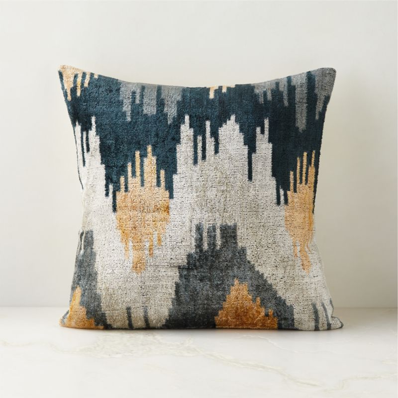Crafted with fine Turkish silk, throw pillow is a luxe living-room accent. Through a meticulous process of spinning, warping and dyeing, each silk pattern emerges on the handloom in a mix of tonal blues, light sand and white. Solid linen back can serve as a neutral option if needed. CB2 exclusive.