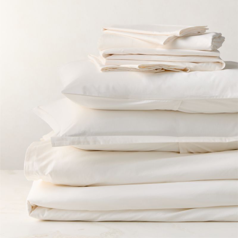 In stock and ready to ship. Loading...CB2SKU 466056Premier Warm White Organic Cotton Percale 500 Thread Count King Bedding SetSet Savings $490.00 open stock $517.95Free Shipping Eligible0 of 1 purchasedAdd to Cart