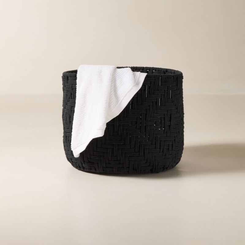 Black cotton rope is woven by hand to create a generously sized storage basket. The tight, geometric weave and hidden iron frame keeps things neat with soft, touchable texture. CB2 exclusive.