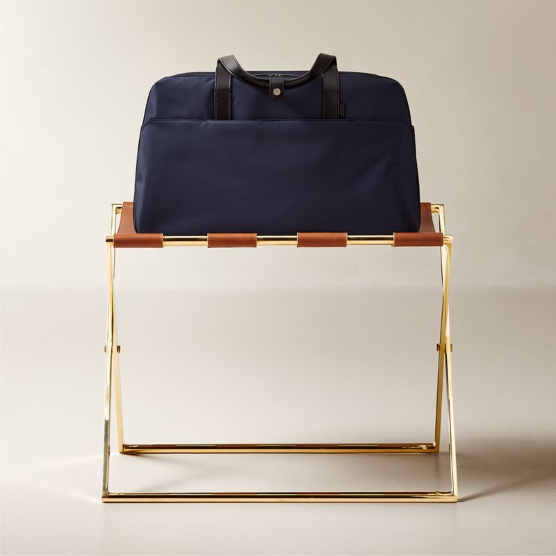 Mermelada Estudio, polished brass luggage rack offers an elevated hotel experience for the guest room. Supple top-grain leather straps and a foldable design make it easy to store. Brass is unlacquered, offering a living finish that will develop the patina of a vintage find. CB2 exclusive.
