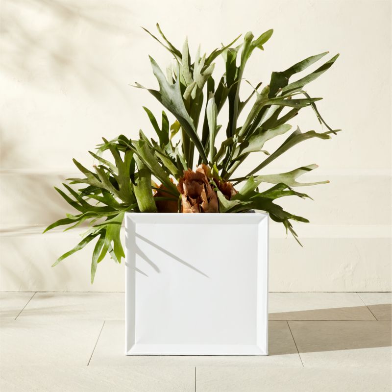 Made of galvanized steel, white planter is a sleek frame for greenery. Designed by Barcelona-based Mermelada Estudio, the planter is painted by hand for a modern finish. Pair with the other Varo planters for a cohesive look. CB2 exclusive.